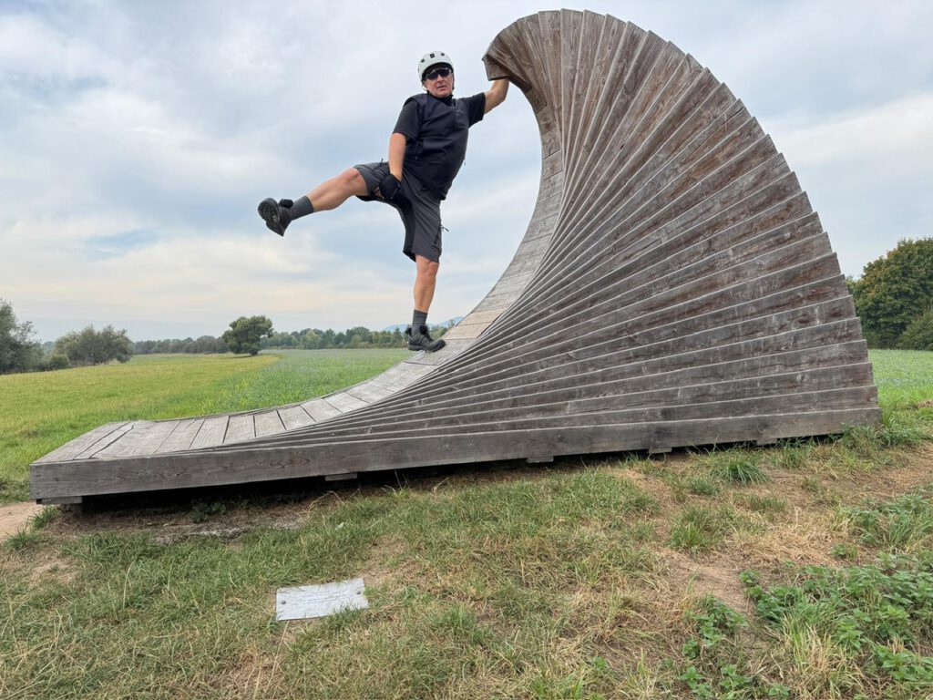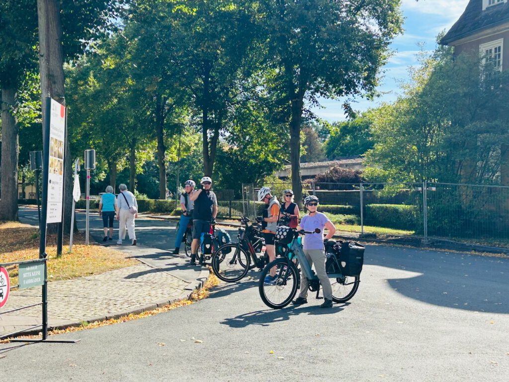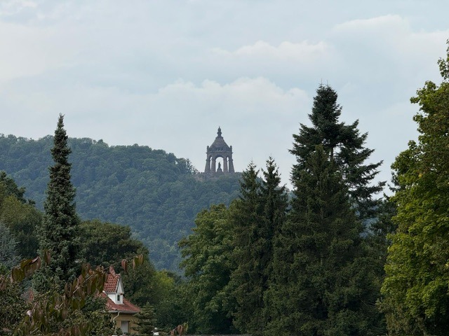 bevor wir den weiteren Verlauf unserer Route ausdiskutierten. Die Weser macht bis nach Porta Westfalica einen großen Bogen, so dass es auf dem Weserradweg noch weitere 40km gewesen wären, was für nicht jeden aus unserer Gruppe aufgrund von Gesundheits- bzw. Fitnesszustand sinnvoll erschien. Da wir uns nicht aufteilen wollten, nahmen wir gemeinsam die Abkürzung über den Berg (Veltheim nach PW-Hausberge), was uns eine phantastische Aussicht auf das Kaiser-Wilhelm-Denkmal bescherte.
