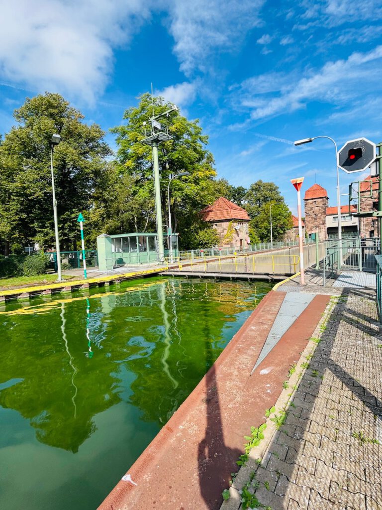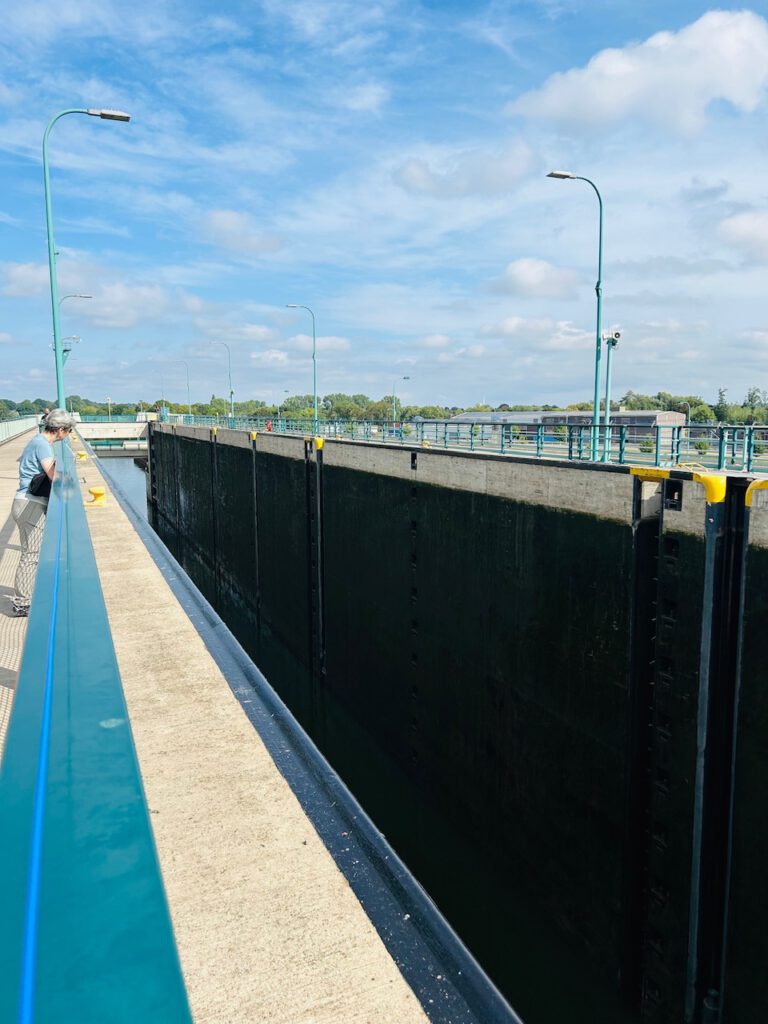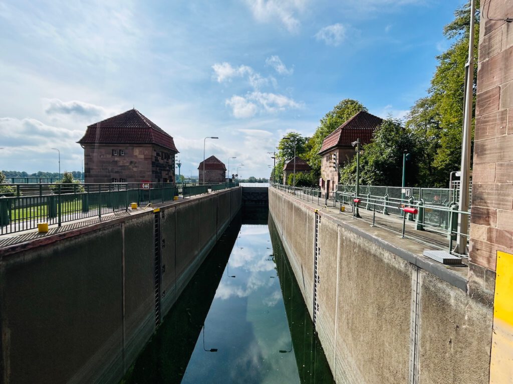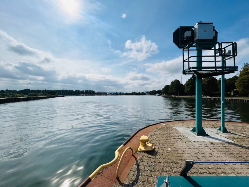 Auch für die Schachtschleuse, mit der Schiffe zwischen Weser und Mittellandkanal wechseln können (mit ungefähr 13m Höhenunterschied) nahmen wir uns ausgiebig Zeit.