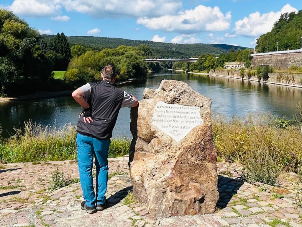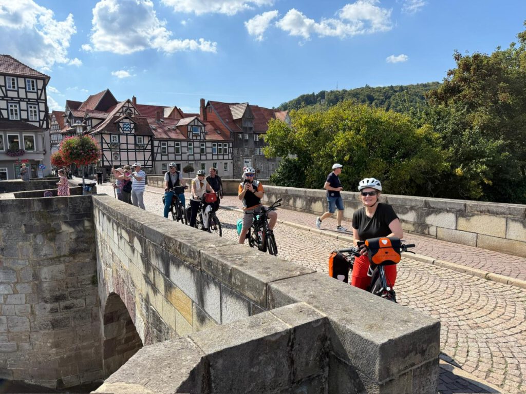 Nun ging es weiter zur Bäckerei Hermann in Groß Ellershausen, wo Ingo und Adelheid bereits auf uns warteten. Nach dem gemeinsamen Frühstück ging es dann ca. 35 km durchs Weserbergland über Dransfeld nach Hann.-Münden, wo „Fulda und Werra sich küssen“ und die Weser startet.