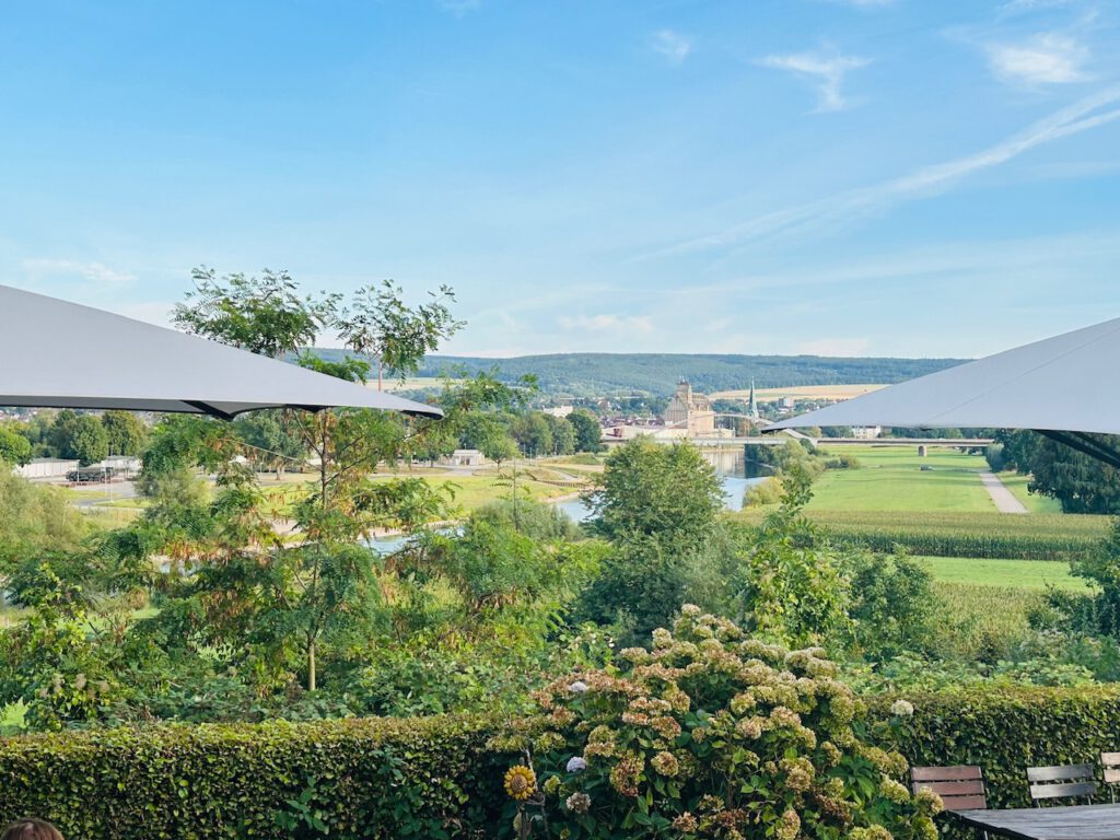 Um zu unserem Hotel Kiekenstein in Strahle zu kommen, mussten wir den Weser-Radweg verlassen und über eine letzte Bergetappe bewältigen. Belohnt wurde das dann mit der phantastischen Aussicht von der Restaurant-Terrasse auf das Wesertal.